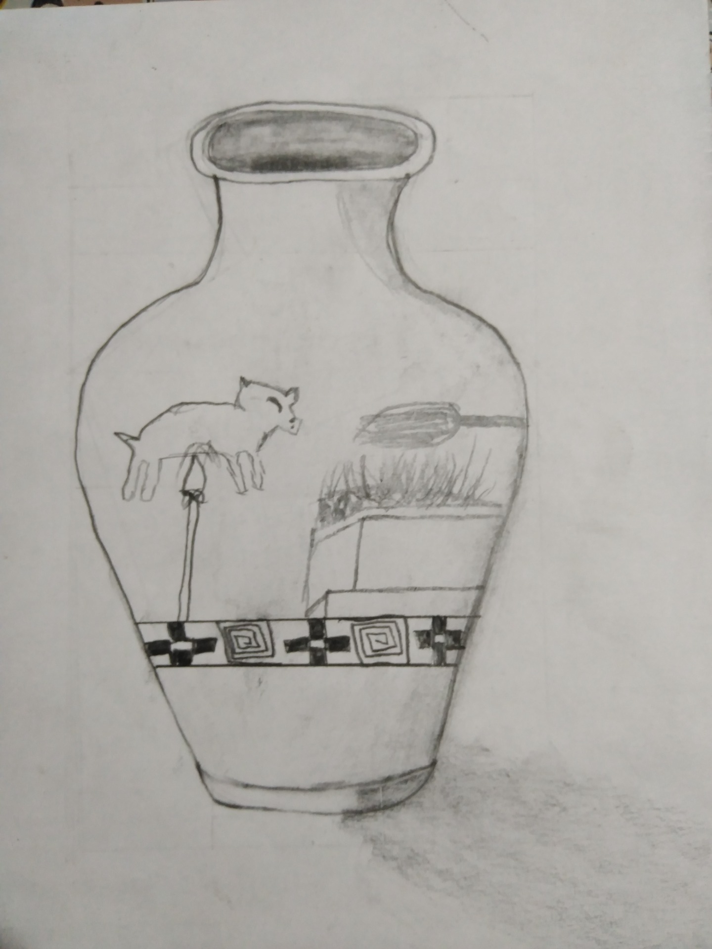 La obra que me llamo la atención trata sobre el sacrificio de animales, esta obra está en un jarrón, el cual voy a dibujar. No menciono el nombre de la obra porque busqué el nombre y no lo encontré.