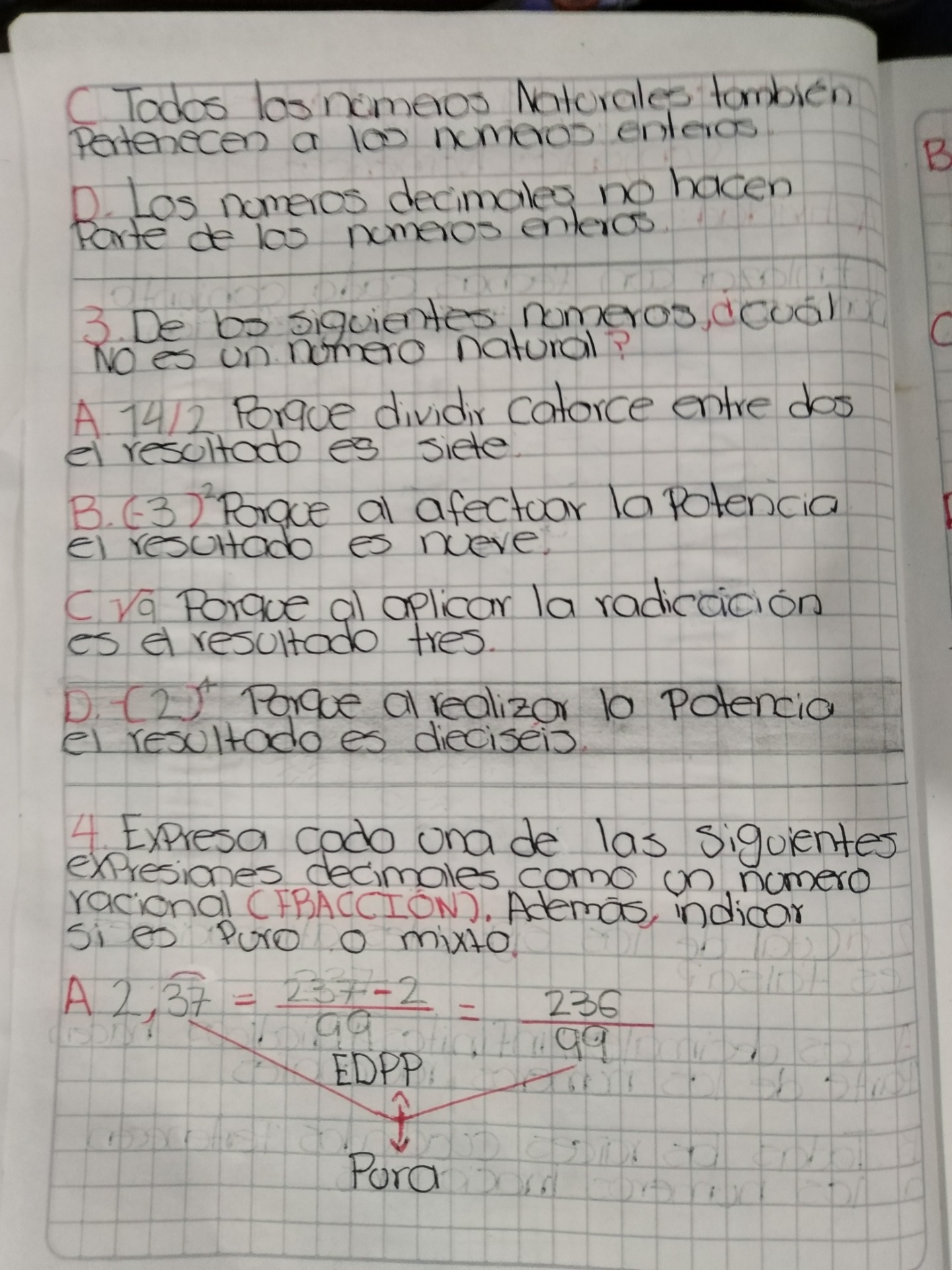 Al realizar la solución de (-2)4 da como resultado 16 porque al solucionar la potenciación, hay que multiplicar el -2 las veces que diga el exponente, así pues (-2) x (-2) x (-2) x (-2) =16 donde se aplica también ley de signos. El 16 no pertenece a los irracionales porque no es un decimal no periódico. Sí pertenece a los naturales porque es un número positivo exacto, también pertenece a los enteros porque permite que haya negativos exactos y a los racionales porque puede expresarse como una fracción si le colocamos un 1 en el denominador no afecta en nada 16.